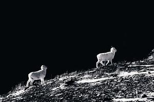 Mountain Goats climbing Pepper Peak overlooking Eklutna Lake