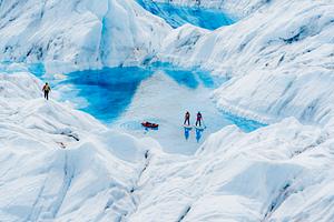 One of my favorite photos. Some folks are enjoying one of the iconic blue pools on Knik Glacier, taken from a helicopter flying overhead.